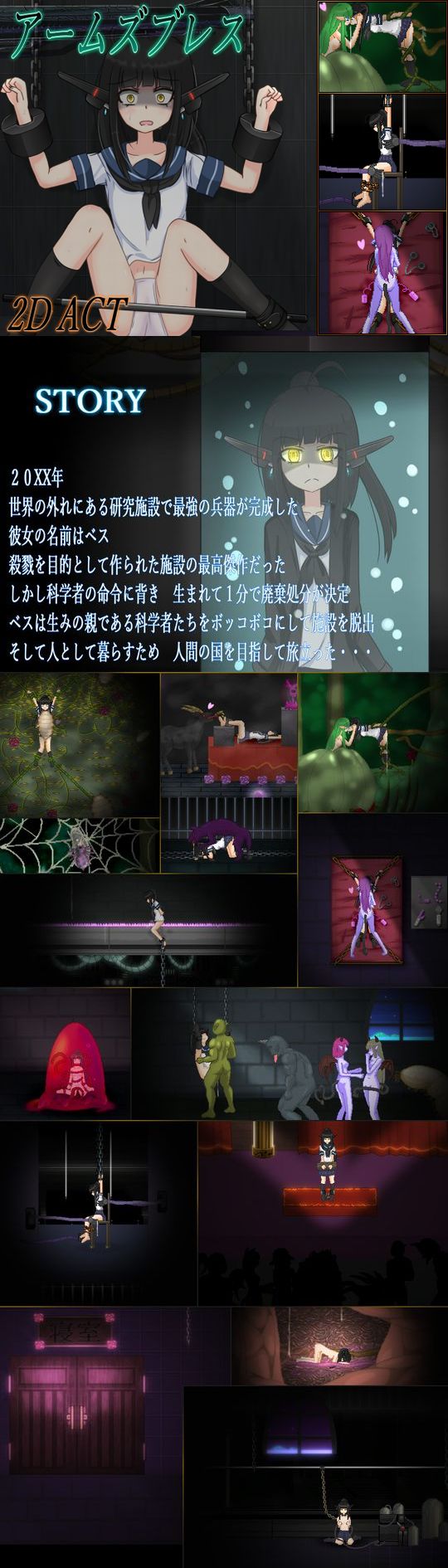 殺戮マシンの少女・ベスが研究施設で完成するも、科学者の命令に背いたために廃棄処分が決定。ベスが施設から脱出し、人間の国を目指して旅立っていく横スクロールアクションだ。ドット絵のリョナシーンなどが搭載されている。