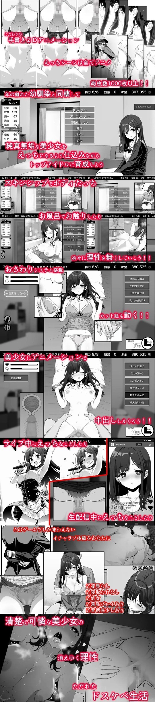 トップアイドルを目指す女の子の夢を叶えるため、同棲しながら育成するイチャイチャ恋愛SLG。最初は性的なことを理性で断ってくるが、少しずつ慣れさせていこう。15以上のHシーンはすべて手書きアニメーション(総枚数1000枚以上)。