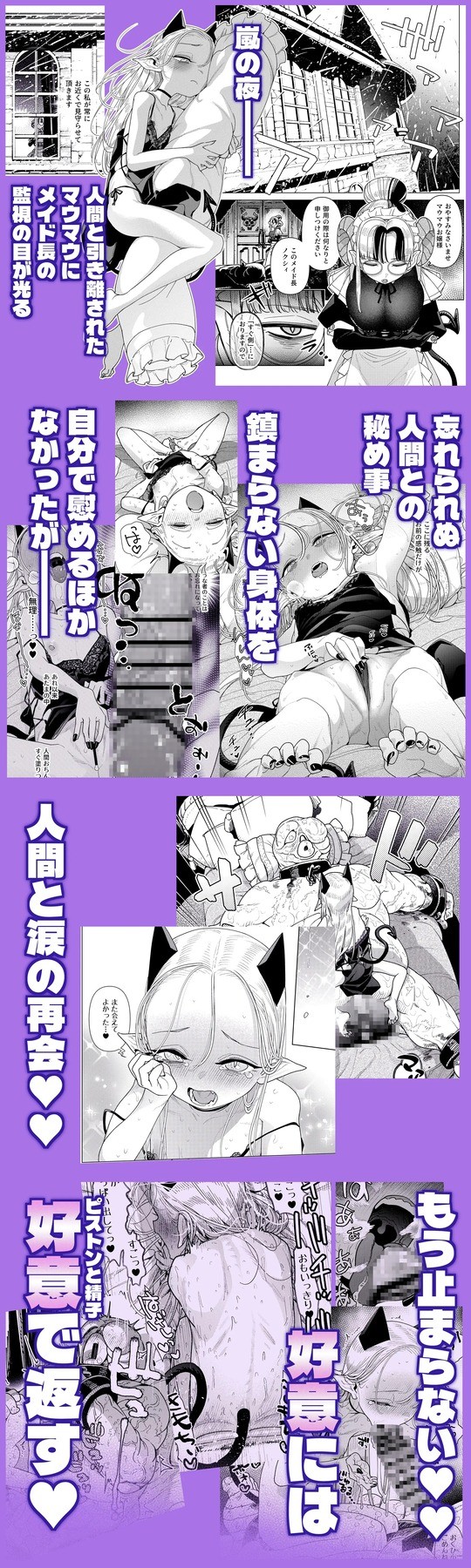 貧乳ロリ系の魔族令嬢のマウマウお嬢様は地下牢に捕らえられた人間に興味を持って関係を持つが、メイド長に知られて引き離されてしまう。オナニーで火照る肉体と感情を抑えていたが、ついに再会して濃厚エッチに没頭する。