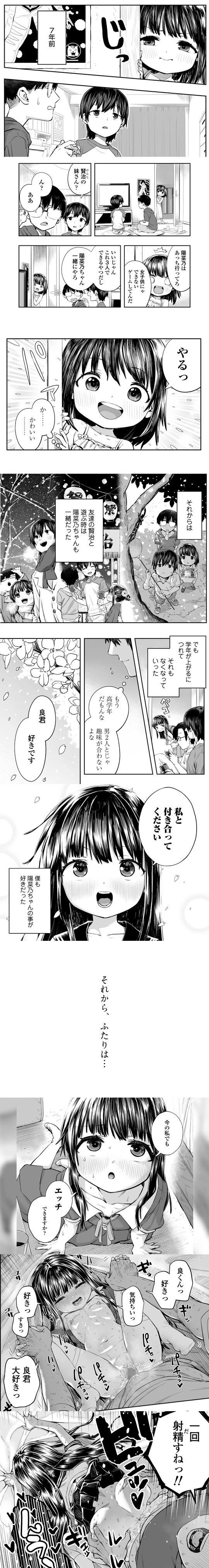 主人公の良君と、友達・賢治の妹である陽菜乃ちゃんの関係を描いた作品。まっすぐな恋愛感情と性欲を向けてくるつるぺたロリっ子の陽菜乃に戸惑いつつも、真摯に応えていく姿が描かれる。本編65ページ。