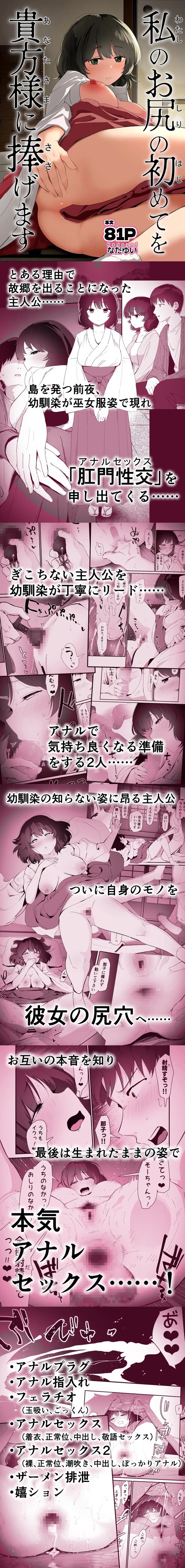 幼なじみの巫女・香良上那子が落ち込んだ主人公・島戸宗太のために、らぶらぶなアナルセックスをしてくれるストーリー。本番はアナルセックスのみ(スカトロなし)。ヒロインが優しく丁寧にリードする巫女服着衣アナルセックスや前戯プレイなどが楽しめる。本文81ページ。