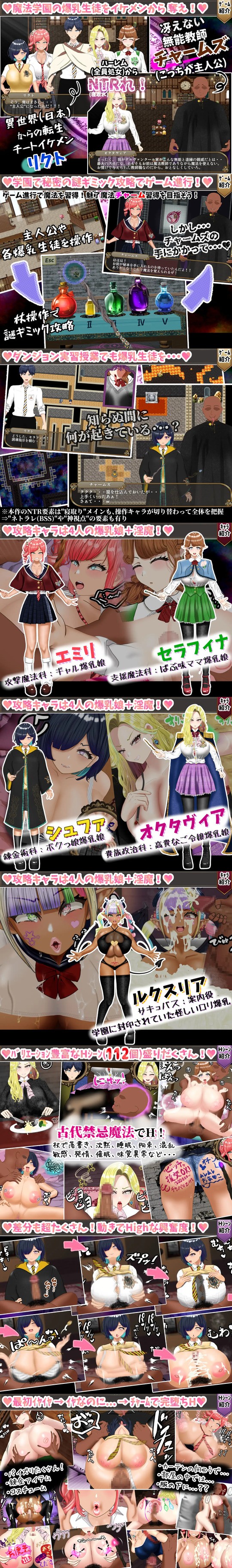 魔法学園で中年魔法教師のチャームズが淫魔と出会って人生が一変し、爆乳生徒を攻略して回るRPG。謎ギミック攻略やダンジョン実習を通じて爆乳生徒を堕としていく。爆乳パイズリのほか、さまざまなHシーンが112シーンと、たっぷりと用意される。
