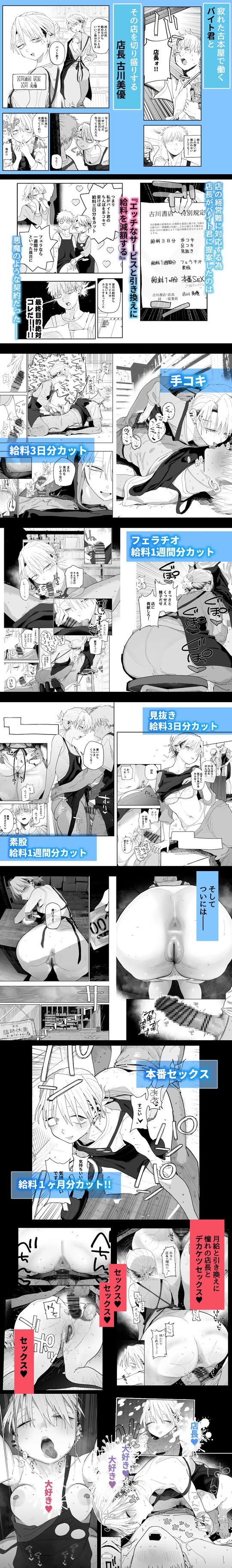 寂れた古本屋でアルバイトをしていたところ、店を切り盛りするダウナー系デカ尻パワハラ女店長が『エッチなサービスと引き換えに給料を減らす』という提案をしてきた。プレイ内容に応じて給料が減額され、本番行為では1ヶ月分の給料を失う。本文77ページ。