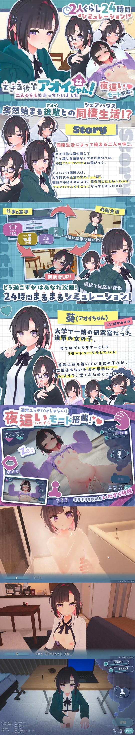 不動産会社の手違いで、可愛い後輩アオイと同棲生活を送ることに。料理、掃除、洗濯などの共同生活を通じて親密度がアップすると、アオイの反応に変化が。通常のエッチのほかに覗きや夜這いも楽しめる。