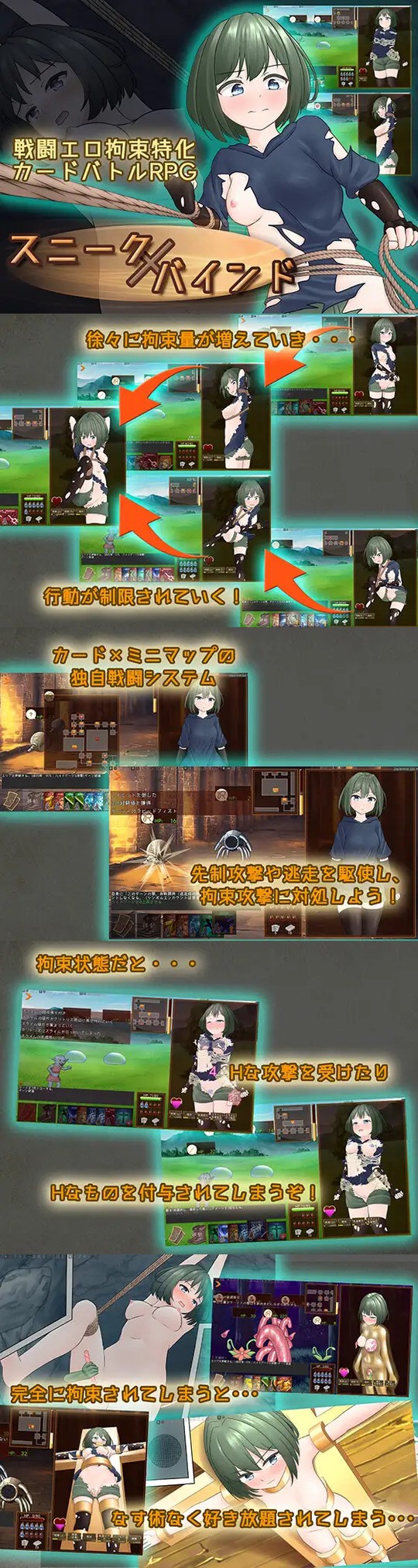 ヒロインが徐々に行動を制限されていく段階拘束を中心に、完全に身動きが取れなくなった状態で快楽に抗えない様子までを描くカードバトルRPG。合計5段階の拘束状態に遷移し、段階が進むほど抜け出しが困難になる。