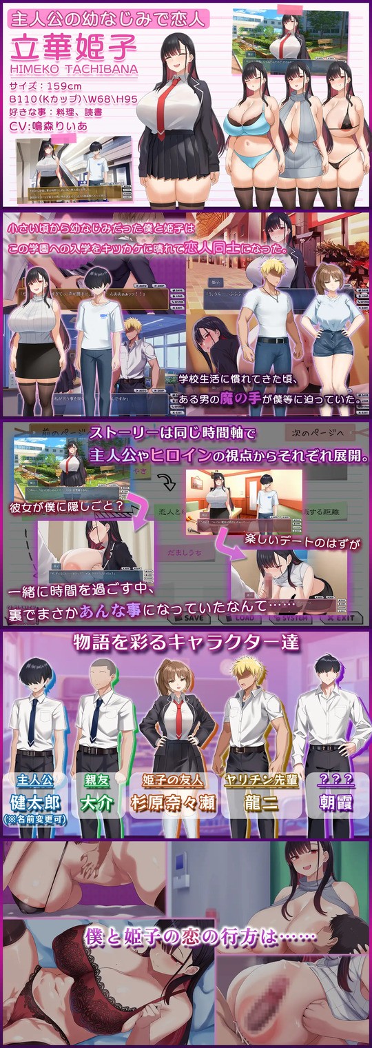 主人公が爆乳幼なじみの立華姫子と同じ学園に入学して恋人同士になるも、姫子に魔の手が忍び寄るネトラレストーリー。主人公のほか、ヒロイン、サブヒロイン、竿役のそれぞれの視点で描かれ、寝取られていく過程が満喫できる。ヒロインはフルボイス。