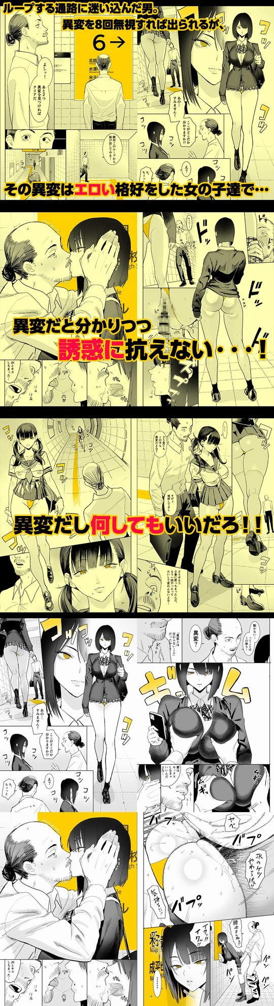 「8番出口」的なループする通路へと迷い込んだ主人公。異変を8回無視すれば脱出できるのだが、その異変はエロい格好をした女の子たち。異変だと分かっていても誘惑に逆らえず、エロい女子との行為に及んでしまう。42ページ(本文38ページ)。
