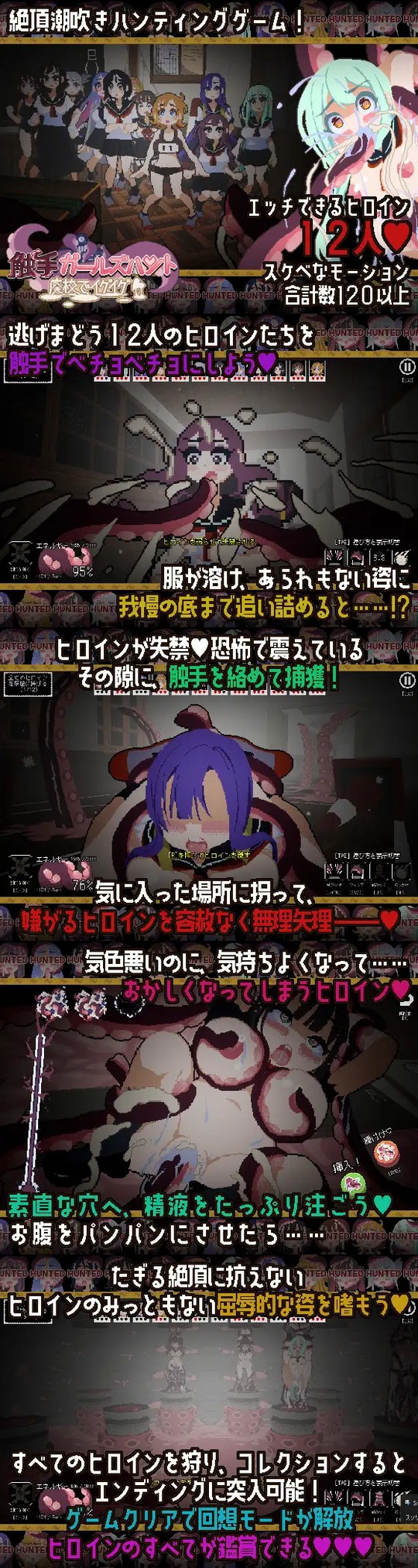 ドスケベな触手になって、廃校を逃げまどうヒロインたちを追い回し、無理やり連れ去って快楽を植え付ける2.5Dハンティングゲーム。簡単な操作でヒロインたちを追い詰めていこう。12人のヒロインが登場し、120以上のスケベモーションを搭載。