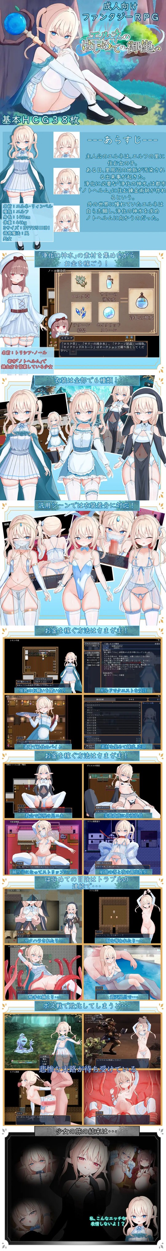 魔法使いのエルフ少女・エルネが「浄化の神水」を求め、錬金術師の少女とともに都市で行動するストーリー。素材を集めながらお金を稼いでいくが、お金稼ぎや冒険ではエッチな目に遭うことも。基本HCG 38枚、エンディング4種類を搭載。