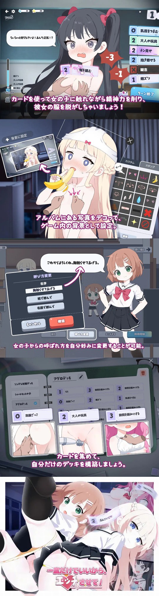 女の子を触ったり服を脱がしたりできるカードバトルゲーム。カードを使って女の子に触れながら精神力を削り、服を脱がしていく。女の子に勝利すると、エッチなことができるようになる。