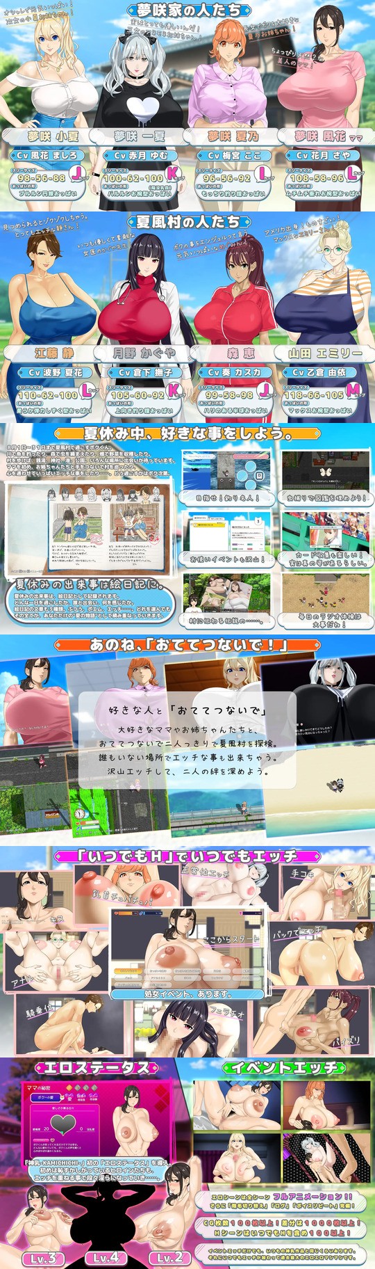 少年の主人公が夏休みの間、母方の親戚の「夢咲家」が住む田舎の夏風村へ行くことになるハートフルおねショタ夏休みRPG。爆乳の三姉妹とそのママが住む夢咲家へ泊り、夏休みの一ヶ月間を自由に過ごす。爆乳のサブヒロイン4人も登場する。